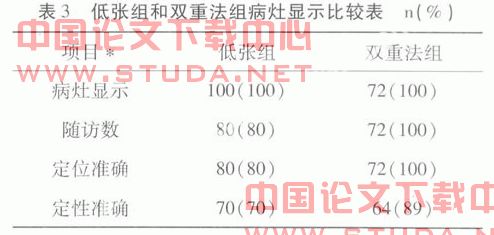 2.3 病灶显示的比较 低张组和双重法组的病灶诊断统计情况见表3。