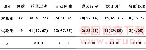 1.2 方法 两组在住院期间均接受了专科系统的健康,出院时在心理卫生、饮食调节、药物治疗、矫正不良习惯、推拿按摩几方面进行指导出院时患者均表示接受并已掌握指导内容;试验组出院后即进行家庭护理干预,护士每月家访1~2次;对照组不进行干预。