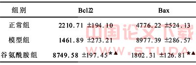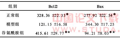 观察各组Bcl-2、Bax蛋白表达区域光密度的变化。术后第21天,谷氨酰胺组Bcl-2的平均灰度值及表达阳性的面积明显大于其他组,Bax基因蛋白平均灰度值及表达阳性的面积明显小于其他组。见表1、表2。