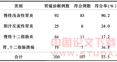 表4提示二者诊断浅表性胃炎的符合率最高,说明胃电图检查对浅表性胃炎的初诊率较高,而对其他几种器质性疾病的初诊率不高。