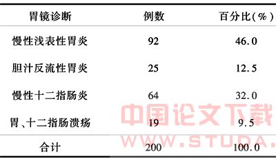 本组200例小儿上腹痛患儿中,从胃镜检查分析以慢性浅表性胃炎(46.0%)、十二指肠炎(32.0%)为主,胆汁反流性胃炎占12.5%,溃疡患儿所占比例最小(9.5%)。