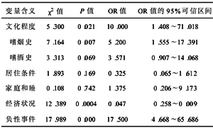 2.2 配对资料的单因素分析 差异有显著性意义的因素是文化程度、个人行为中的嗜烟史、状况及家庭负性事件的发生(见表2)。
