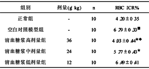 经统计学处理:空白对照模型组与正常组相比差异有显著性,提示造模成功。清血糖浆高、中剂量组在给药前后能显著性的降低血虚小鼠RBC.ICR,与模型组相比差异有显著性,而清血糖浆低剂量组无此作用。在给药后,清血糖浆高剂量组与正常组相比无明显差异(P>0.05),而清血糖浆中、低剂量组则与正常组相比有明显的差异(P<0.05)。