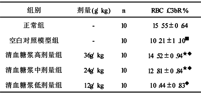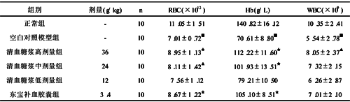 经统计学处理:模型组在RBC和WBC数量上及Hb的含量上均显著性的低于正常组(P<0.01),说明造模成功。清血糖浆高、中剂量组能显著性的提高血虚小鼠的RBC和Hb的含量,其中,高剂量组还能显著性的提高血虚小鼠WBC的数量,清血糖浆低剂量组血虚小鼠的RBC、WBC的数量和Hb的含量与空白对照模型组差异无显著性。阳性对照东宝补血胶囊组能显著性的提高血虚小鼠的RBC的数量和Hb的含量,但对血虚小鼠的WBC的数量无明显影响。清血糖浆高剂量组与正常组相比差异存在显著性。