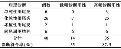 2.1 超声诊断阑尾炎符合率 见表1,40例经临床手术病理证实各型阑尾炎,超声未发现异常者3例,右下腹仅见少量积液未见肿大阑尾及包块者2例,低频探头检出14例(35%),高频探头检出35例(87.5%),1例坏疽性阑尾炎误诊为化脓性阑尾炎,1例阑尾周围脓肿合并右侧附件炎。