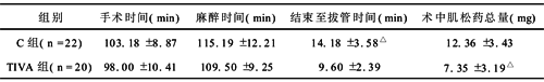 2.2 手术情况比较 两组在麻醉时间、手术时间、术中肌松药总量方面差异无显著性,TIVA组患者手术结束至拔管时间较C组短(P<0.05),见表2。