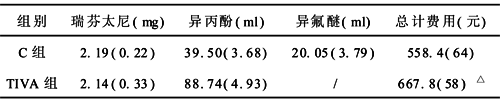 2.5 两组麻醉药品费用比较 TIVA组高于C组患者,见表5。