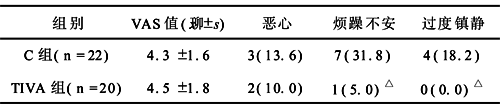 2.4 两组术后情况 两组患者术后镇痛评分(VAS值)差异无显著性,TIVA组苏醒过程平稳,较少发生镇静过度或烦躁等副作用,见表4。