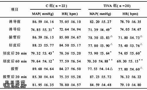 1.2 试验步骤 行UPPP术的OSAS患者按照随机数字表随机分为两组: TIVA 组(n=20例)诱导采用瑞芬太尼1 μg/kg,异丙酚2.5 mg/kg及琥珀胆碱1.5 mg/kg后经鼻插管,维持采用瑞芬太尼0.2 μg/(kg·min)+异丙酚4~6 mg/(kg·h)全凭静脉麻醉,在手术结束前15 min停止瑞芬太尼,追加氯诺昔康8 mg。C 组(n=22例)诱导采用芬太尼2 μg/kg,异丙酚2.5 mg/kg及琥珀胆碱1.5 mg/kg后经鼻插管,维持采用异丙酚4~6 mg/(kg·h)+异氟醚(维持呼出浓度在0.8~1.2 MAC)静吸复合麻醉,手术结束前30 min关闭吸入,改用异丙酚6~8 mg/(kg·h)输注,切皮前5 min及术中追加芬太尼。两组患者术中肌松药均采用维库溴胺,以患者出现明显体动或吞咽反应再追加肌松药。记录诱导前、诱导后、插管后、切皮后、切皮后20 min、切皮后60 min、拔管后、拔管后20 min、拔管后60 min的MAP、HR;两组手术时间、手术结束至拔管的时间、术中肌松药总量及术后躁动、恶心呕吐、疼痛等不良反应,并比较两组麻醉药总量和费用。