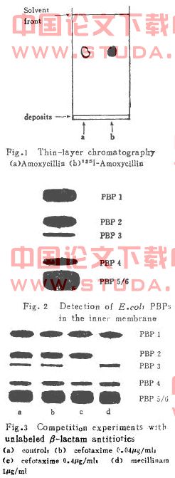 一经氨节青霉素、细菌内膜蛋白进行竞争性结合实验,结果见Fig.3。从中可见,头抱喷厉的特异靶位是PBP:,而Micillinam的特异靶位是PBP3,与报道的结果相符(8)。