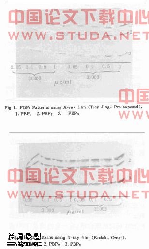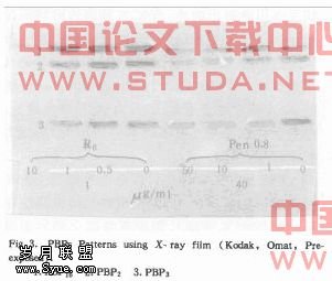 氖标记物穿透力较弱,用一般放射自显影方法不能得出图象,本实验采用荧光放射自显影法(6-8)(Fluoro,aphy),检测聚丙烯酞胺凝胶片上3H标记的蛋白质,有一定的优点。PPO是荧光增效剂,其作用原理不是直接依赖sH放射出来的日射线,而是藉助3H上的日粒子与PPO相互作用发射出的光,造成x光底片的局部发黑得到深浅不同的暗线,从而获得青霉素结合蛋白的图谱。肺炎链球菌的PBPs图谱上可见有三条区带,即p即;(a,b),pBpZ和pBp3。一般情况下,青霉素浓度越大,亲和力越强,颜色越深,在竞争性试验中,甲氧西林浓度越大,亲和力越强,颜色越浅。