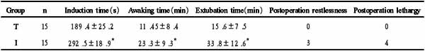2.2 表2表明诱导时间、苏醒时间及拔管时间T 组比I组均明显要短,两组比较差异有显著性(P<0.05)。且T 组术后无麻醉并发症发生,I组有3例躁动(3/15,占20%),4例呈嗜睡状态(4/15,占37%)。