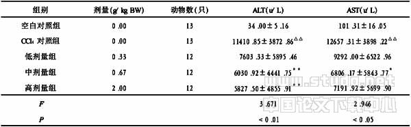 注:空白对照组和CCl4对照组比较采用t检验,△△P<0.01;各剂量组与CCl4对照组比较采用方差分析;比较**P<0.01,*表示P<0.05