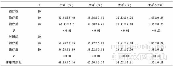 2组治疗前CD3+、CD4+、CD8+T细胞均明显低于健康对照组(P<0.05),CD4+/CD8+明显高于健康对照组(P<0.05),治疗后2组CD3+、CD4+、CD8+T细胞均有提高,CD4+/CD8+比值下降,治疗组优于对照组(P<0.05),见表3。
