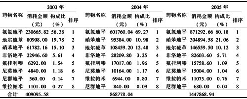 1 2003~2005年我院钙拮抗剂消耗金额构成比及排序