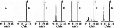 A-空白溶液;B-对照品溶液;C-片剂溶液;D-碱破坏;E-酸破坏;F-高热破坏;G-光照破坏;1-普卢利沙星