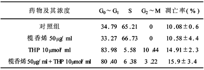 表2 榄香烯联合THP处理对Hca-F细胞周期与凋亡的影响