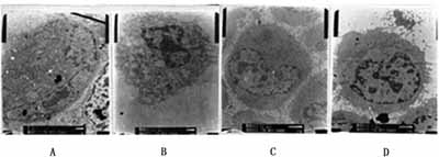 1.7 榄香烯联合THP处理对瘤细胞超微结构的影响[3] Hca-F细胞用榄香烯、THP单一或复合处理,细胞浓度和处理方法同前,处理时间为1h,收细胞,用PBS洗3次,以2.5%戊二醛固定,常规包埋制片,铀—铅双染色,透射电镜下观察摄片。