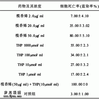 2.1 榄香烯联合THP处理对Hca-F存活的影响 单纯用榄香烯处理,Hca-F的存活率就明显降低,在30min~1h的时间内,细胞死亡率随着药物浓度增加而增加(表1),单用THP处理,也可导致Hca-F细胞死亡、蓝染,其细胞死亡率也随着药物浓度增加而增加,榄香烯联合THP处理,肿瘤细胞死亡率可达100%。