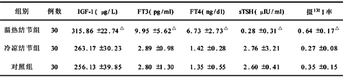 胰岛素样生长因子1(IGF-1)是一类促进细胞生长、具有胰岛素样代谢效应的因子,其在血清中的浓度受营养状态、激素、遗传等多因素的调节,在内分泌代谢病病理过程中发挥重要作用。人体内多个组织和脏器都表达IGF-1基因,特别是在甲状腺组织中可通过内分泌、自分泌和旁分泌等方式精细地调节甲状腺滤泡上皮细胞(TEC)的分化和发育,介导甲状腺激素的合成与释放。本文对一组单纯性甲状腺肿病人的甲状腺功能及IGF-1进行检测并加以分析,从而了解温热结节、冷凉结节与对照组三者之间的复杂关系。
