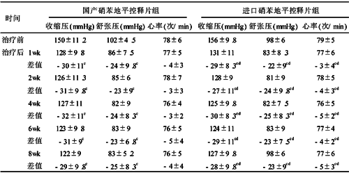 表1 国产硝苯地平控释片组与进口硝苯地平控释片组治疗前后血压、心率的变化 (x±s)