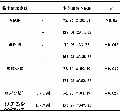 表2 肿瘤组术前血清VEGF与肿瘤临床病理参数的关系 (x±s,μg/L)