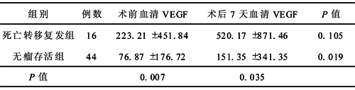 表3 死亡及转移复发者与无瘤存活者术前的血清VEGF水平比较 (x±s,μg/L)