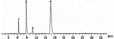1-巴洛沙星;2-羧酸乙酯;3-螯合物Ⅰ;4-螯合物Ⅱ1.3 色谱条件 色谱柱:SMT C18柱(5μm,4.6mm×250mm);流动相:乙腈-0.4%十二烷基硫酸钠溶液(47:53)[用枸橼酸(1.5mol/L)调pH值至3.0];检测波长:295nm;流速:1.0ml/min;柱温:室温;进样量:20μl。