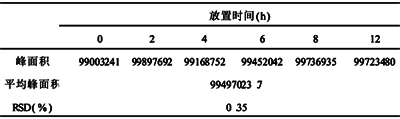 2.6 溶液的稳定性试验 取供试品溶液,分别于0、2、4、6、8、12h测定,测得溶液在12h内的平均峰面积为99497023.7,RSD为0.35%,说明本品溶液基本稳定。结果见表2。