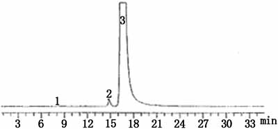 采用上述不同的色谱柱和流动相进行实验,结果表明:采用色谱柱(1)或(2)及流动相(1),虽然主峰出峰时间适中且峰形较好,但各中间体在此流动相中50min都未见出峰;采用色谱柱(1)或(2)及流动相(2),样品及各中间体出峰时间适中,但峰拖尾严重;采用色谱柱(3)及流动相(2),样品及各中间体出峰时间适中,且峰形较好。所以选择采用色谱柱(3)及流动相(2)来检测本品的有关物质。