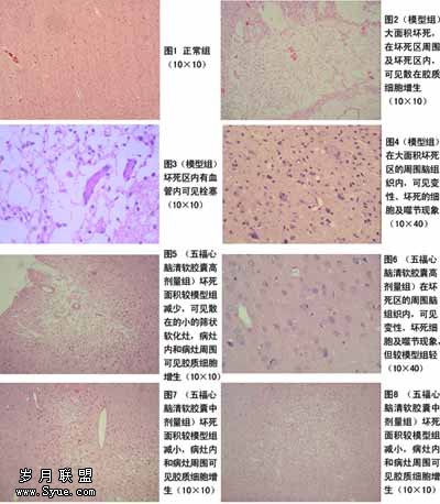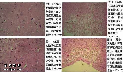 2.2 五福心脑清软胶囊对大鼠多发性脑梗死模型形态学的影响 HE染色结果表明,模型组可见大片脑组织坏死,坏死区周围可见胶质细胞增生,残余组织可见神经细胞变性,脑实质有水肿,坏死区的血管可见栓塞。各治疗组脑实质坏死面积明显小于模型组,在皮层可见筛状软化灶,软化灶周围及坏死灶中可见散在胶质细胞增生,神经元仍有变性(图1~12)。