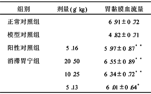 2.1 对大鼠慢性萎缩性胃炎及胃癌前期病变动物模型的影响[2] Wistar大鼠60只,全部雄性,体重(220±20)g ,每只大鼠足底注射佐剂抗原(同种大鼠胃黏膜浆与Freund佐剂以1:1配成乳剂)0.3ml/次,1次/4w,共2次,去氧胆酸自由饮水,浓度为20mmol/L。猪胆汁离心后置-20℃冰箱备用,使用前溶解至冰水混合物,抽取液体部分,按 12.5ml/kg给大鼠皮下注射,1次/d,共90天。饥饱失常:2天喂食,1天停食,保证足量,自由饮水。60只大鼠随机分为6组,每组10只,以下4组在造模90天均连续用消滞胃宁和阳性对照药温胃舒颗粒灌胃50天,其剂量分别为:消滞胃宁低剂量5.13g/kg;消滞胃宁中剂量10.25g/kg;消滞胃宁高剂量组20.50g/kg;阳性药对照组5.16g/kg,各组在给药期间记录动物一般情况和质量变化。给药结束后,各组大鼠禁食24h,自由饮水,用10g/L戊巴比妥钠(40mg/kg)麻醉后,打开腹腔,沿胃大弯侧作一0.8~15cm切口,将胃内容物冲洗干净,将多普勒血流计光纤探头轻放于胃小弯黏膜上,保持中等压力而没有距离,多普勒血流计频移范围为5~7kHz,时间常数选1s,量程选X1,用特制的外径2.8mm,长2m的光纤探头,输出功率>1mW,测定范围为半径1.5mm半球形体微区;血流量单位用多普勒信号的电压值“u”表示,试验开机预热30min,并调零后进行测定。测定后杀检各组大鼠,摘除大鼠胃,沿胃大弯剪开,生理盐水中洗净胃黏膜,肉眼观察胃黏膜大体情况后固定于10% 甲醛液中,供病理组织镜检。