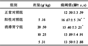 2.3.2 对小鼠热板法痛阈值的影响 取健康雌性昆明种小鼠50只,体重18~22g,分组给药剂量见表2,连续灌胃3天,于末次给药30min后,将小鼠放于50℃的热板仪上,以小鼠“舔”后足作为“疼痛”的反应指标,观察记录小鼠从放置到热板上到小鼠因热痛而舔后足之间的时间(为热板痛反应时间),结果见表4。