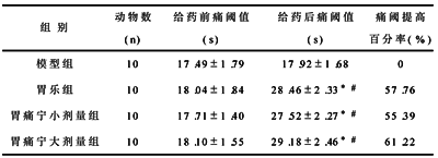 4.2.2 热板法 见表3,用药前各组平均痛阈值差异无显著性(P>0.05),用药后胃痛宁小剂量组、胃痛宁大剂量组及胃乐组平均痛阈值提高,与用药前比较差异有显著性(P<0.01);组间比较,3组用药后痛阈值比模型组明显增高(P<0.01),胃痛宁大剂量组优于胃乐组,但差异无显著性(P>0.05)。