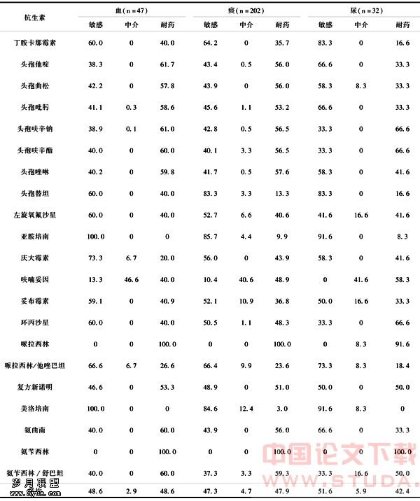 表1 血、痰及尿标本中的肺炎克雷伯菌对抗生素的耐药率 (%)