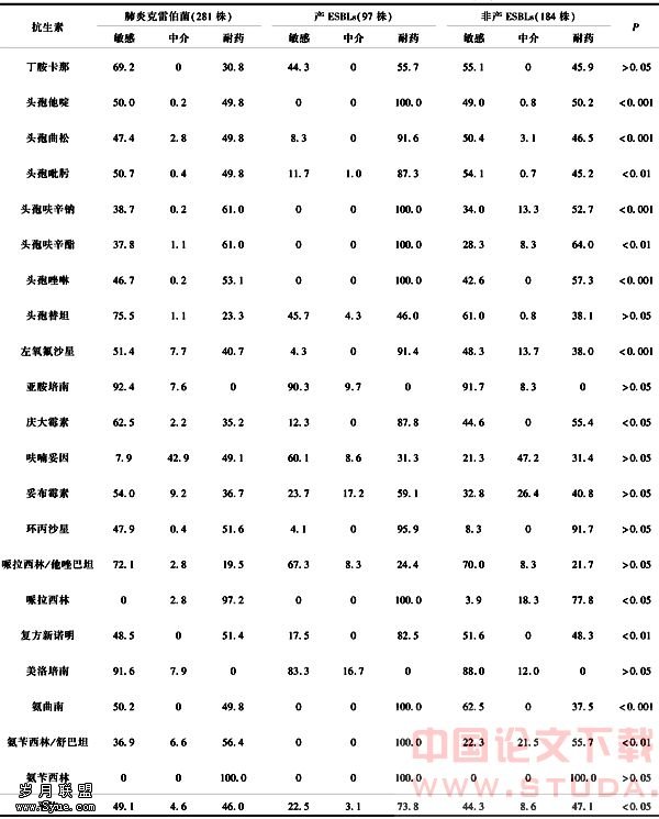 注:P值为产ESBLs与非产ESBLs肺炎克雷伯菌之间的耐药率比较