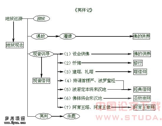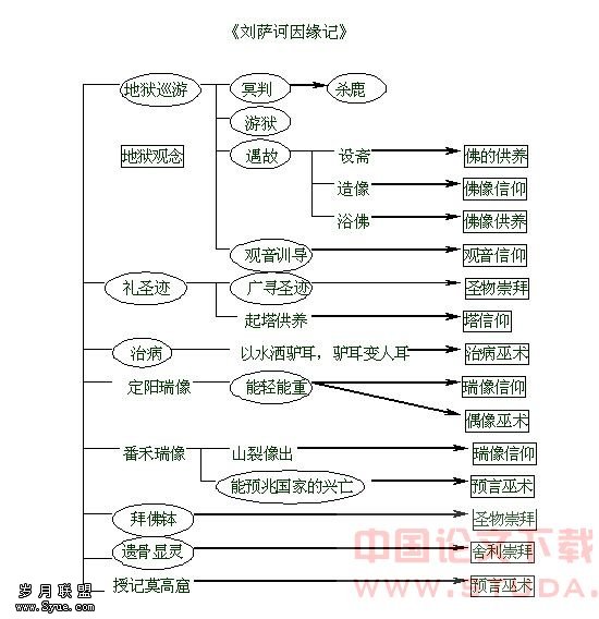 先是因为传闻的盛行,促成了信仰的形成,而信仰形成之后,又滋生了更多的传闻。当刘萨诃还是一个凡人时,他的各种传闻已风行于世,其中最著名的就是地狱巡游和江东礼拜阿育王塔、像。伴随着他的传教活动,又产生了诸如为驴耳王治病、定阳瑞像、酒泉迁化等传闻。很可能在他生前就已被视为神明,由此产生了“苏合圣”、“胡师佛”、观音菩萨假形化俗等一系列传闻。和尚迁化之后,他已经成为一种信仰符号,所以他的传闻更是不断地滋生蔓延开来。我们并不准备对各阶段的传闻内容进行分析,我们更注重的是传闻的形式。如果你对这些传闻的形式稍加注意的话,就会发现一个有趣的现象:刘萨诃传闻是由一个个彼此无关亦无序的独立故事单元拼凑成的,在某一故事单元里,一方面与佛教的某个重要的信仰、观念以及实践紧密相关,另一方面连情节的安排都有固定的模式。可以借用民间故事的母题研究,将佛教传闻的基本信仰单元和情节单元也称作“母题”。以下就对记述刘萨诃传说最为丰富的《冥祥记》和《因缘记》进行母题分析。在下图中圆框表示情节母题,方框表示信仰母题。