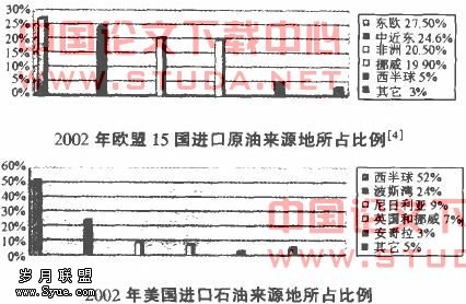 世界能源贸易的90%来自石油。从上表可以看出。欧盟和美国基本实现了石油进1:2来源的多样化(其中,美国在西半球进12:中,加拿大占16%,委内瑞拉占15%,墨西哥占10%),似乎在中东地区并不存在能源利益的聚积和冲突。