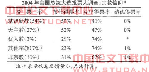 有时宗教团体或者个人对选举的影响甚至更为直接,为所支持的候选人拉选票,动员呼吁选民投票等方式也屡见不鲜。在小布什与克里角逐2004年大选时,时任布什竞选顾问的卡尔·诺夫(Karl Rove)计划动员400万福音派教徒参加投票。“尽管无法其中多少人被动员起来,但布什的选票中有一半以上确实来自那些经常参加宗教活动的选民。”[2]“事实上,大概有60%每周去教堂一次的选民投票支持布什,支持克里者只有39%。”[3]布什连任竞选时有许多美国民众由于伊拉克战争和国内问题并不看好他,而他的成功连任据许多学者分析,在于美国人在投票时很大程度上以道德价值观为依据,他在颇有争议的堕胎权利和同性恋婚姻问题上始终保持强硬,保守和立场的一贯性,显现出虔诚的正统宗教形象,迎合了大多数选民的要求,而战争和经济问题相比价值观则居于次要位置了。下表直观地反映了宗教派别对布什的支持,给了他相对于竞争对手的明显优势。