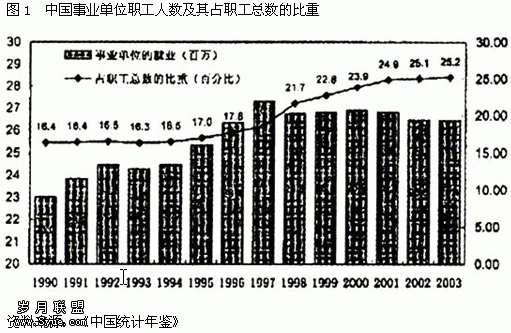 图1显示,事业单位中的正式职工总数在90年代保持增长。虽然就业绝对数的增长到1997年终结,但是占全体职工人数的比重却不断攀升。