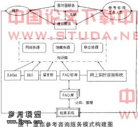 在以本馆资源为主要依托.资源、联合资源为辅的知识库的基础上,提供多种VRS方式,并将咨询过程中有价值的问答归类整理到经常性问题解答(FrequentlyAskedQuestion,简称FAQ)数据库中,并建立此数据库的检索系统。在与传统参考咨询服务相结合的基础上,为读者和咨询人员建立沟通互动平台。图1为VRS模式构建图。
