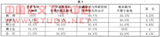 在从未到图书馆查阅过纸本期刊的教师、硕士生和博士生中,究其原因所占比例最大的是认为电子.期刊完全可以满足需要。很多科研人员已经把电子期刊作为获取信息的最主要途径。