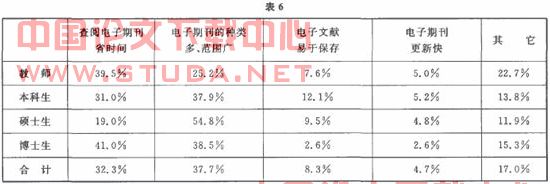 读者把电子期刊数量多、收录范围广和使用电子期刊省时间列为使用电子期刊最主要原因的前两位,充分反映了电子期刊的优势所在。.