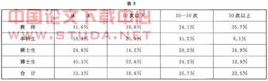 在一年内各组读者,从未到图书馆查阅纸本或查阅过5次以下的均超过了60。这组数据客观地反映了图书馆纸本期刊利用的情况。2004年1月至2005年12月,在本馆订购的188种外文期刊中有77种未被利用过,闲置率为40.96%,被阅览过1—1O次的有81种,占期刊总数的43.06%,被阅览11-50次的有20种,占10.64,而被阅览51次以上的只有1O种。