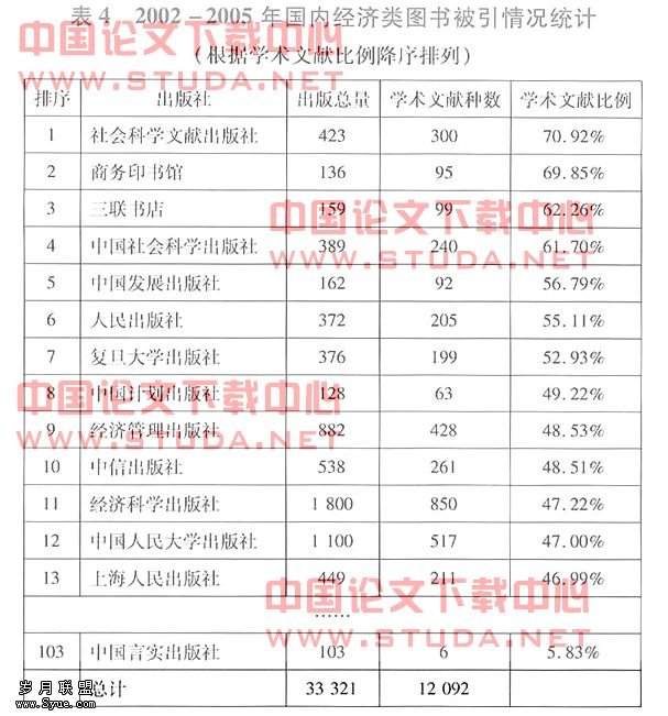 然后,再对表4进行分析:103家出版社四年出版的经济类文献量占四年总量的80%以上,学术文献总量占到83%,可以说是经济领域比较重要的出版社,同样依据布氏定律,可知排在前面的13家出版社也可以被认为是经济学领域的“核心出版社”。