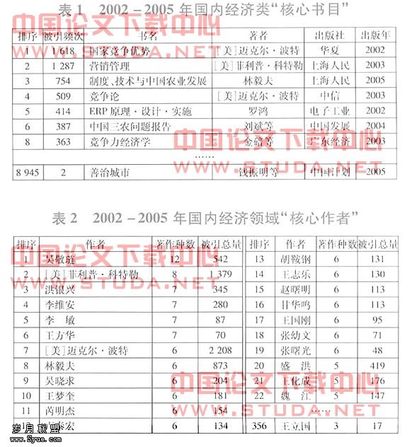 由于《全国总书目》是国内具有代表性的权威书目,出版社覆盖全国各地,基本上能反映我国经济类文献的出版情况,本文试选取2002—2005年《全国总书目》中的经济类书目作为统计样本。由于主要是查证经济类学术研究图书的被引情况,因此对统计样本进行初选,排除以下5类经济类图书:①教材、教学参考书(影印版除外);②培训及资格用书;③经济学基础知识、操作实务、普及读本、创业及励志类图书;④工具用书以及连续性的论文集、评论、年度报告;⑤地方(地区)经济类图书。
