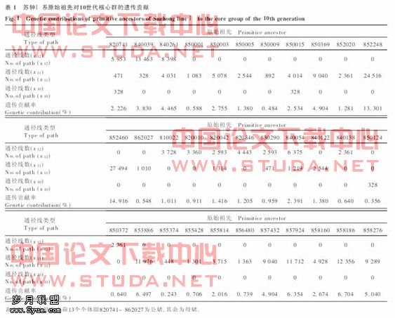 苏钟Ⅰ系10世代核心群由90个个体组成,各原始祖先对其遗传贡献率计算公式如下:y=1/90×[0.25x12+0.5x11+x10]×0.510由以上公式计算出苏钟Ⅰ系33个原始祖先对后代的遗传贡献率,结果列于表1。