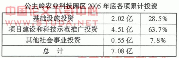 公主岭农业科技园区2005年底累计完成投资7.08亿元,其中各项投资比例见下表。