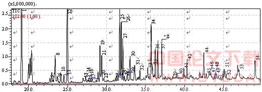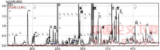 试验比较了美国红鱼腹部肉和背部肉挥发性成分的分析结果,得到总离子流色谱图如图