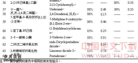 1、2 所示。挥发性组分及其相对百分含量见表 1。图 1、2 显示,腹部肉和背部肉的总离子 流图基本一致。由表 1 可以看出,从腹部肉和背部肉中分别检测出 52 种和 54 种有效挥发性 成分,相同成分有 42 种。这些有效挥发性成分主要是烃类(Hydrocarbon)、醇类(Mellow)、 酮类(Ketone)、醛类(Aldehyde)、酯类(Ester)和环状化合物(Ringy compound),其中 含量较高的是醇类、醛类、酮类,它们在腹部肉和背部肉中分别占挥发性化合物总数的